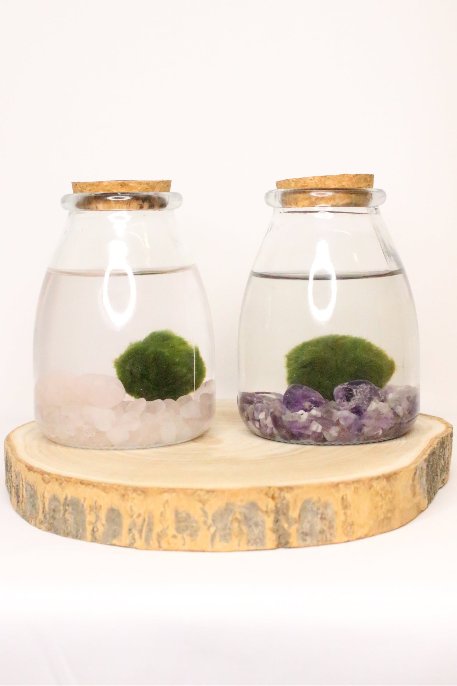 Bola de musgo en terrario acuatico hecho artesanalmente con minerales, aporta calma y naturaleza a tu hogar.