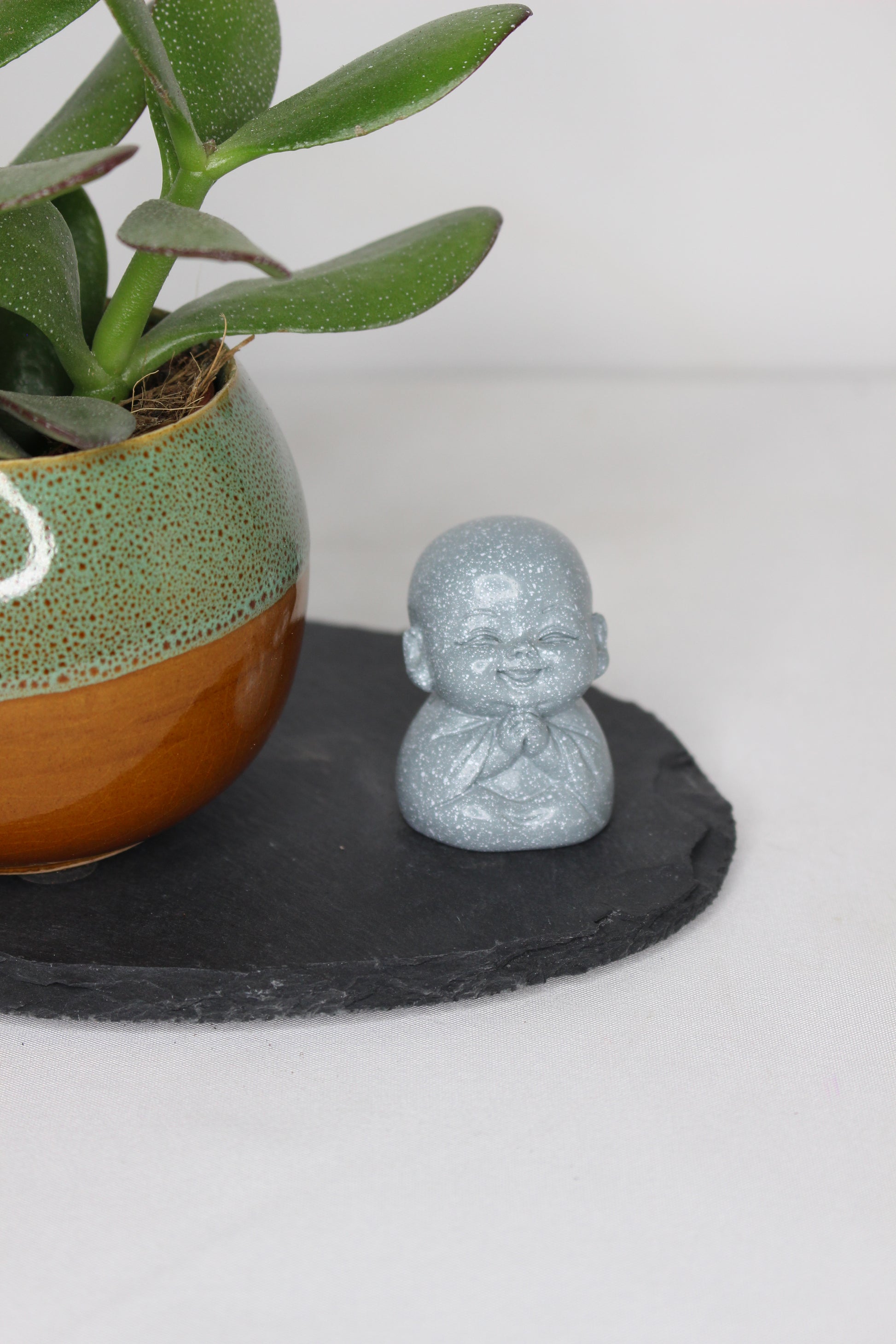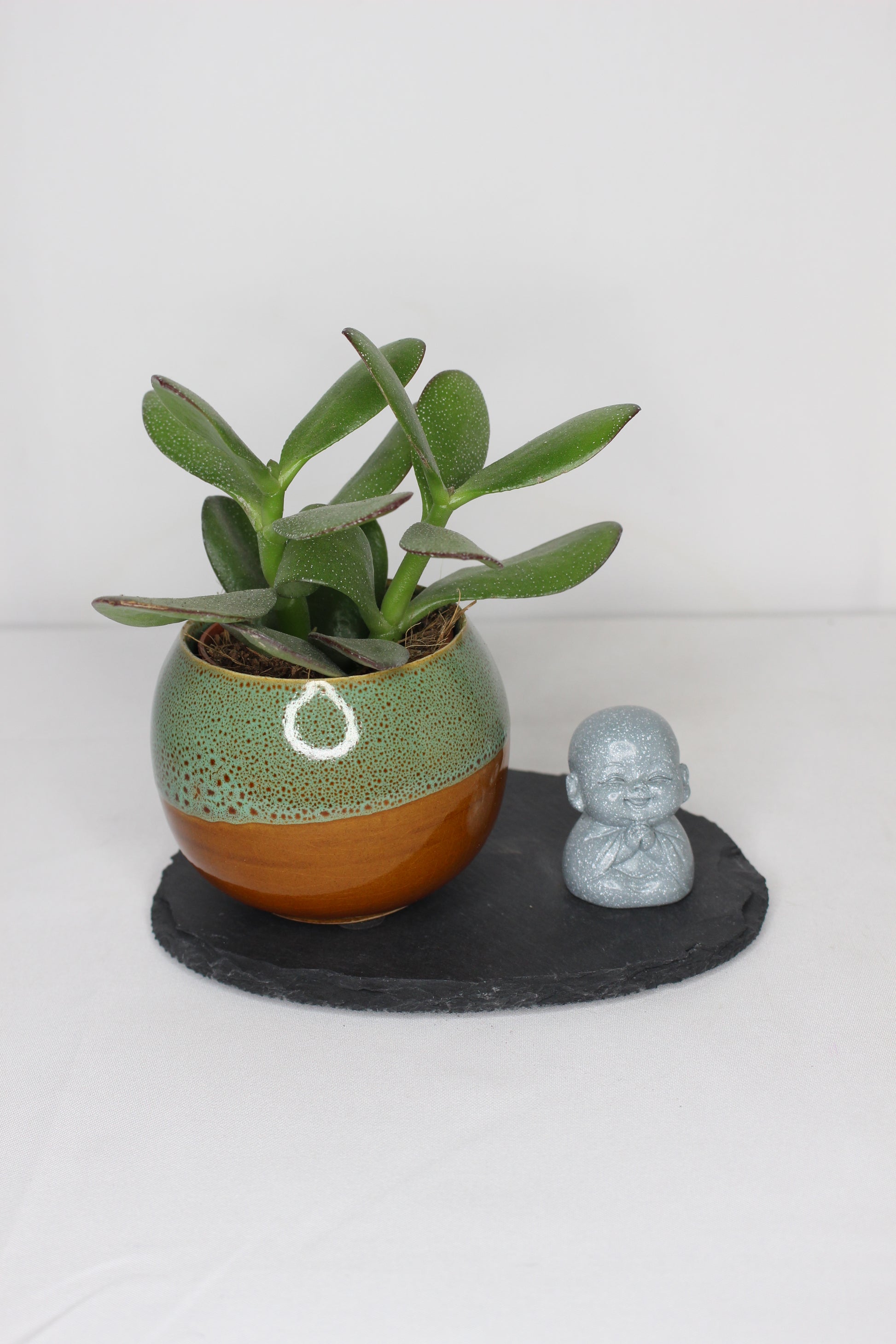 Incluye : Maceta tipo bonsai, Suculenta , Base de pizarra y Figurita de buda.