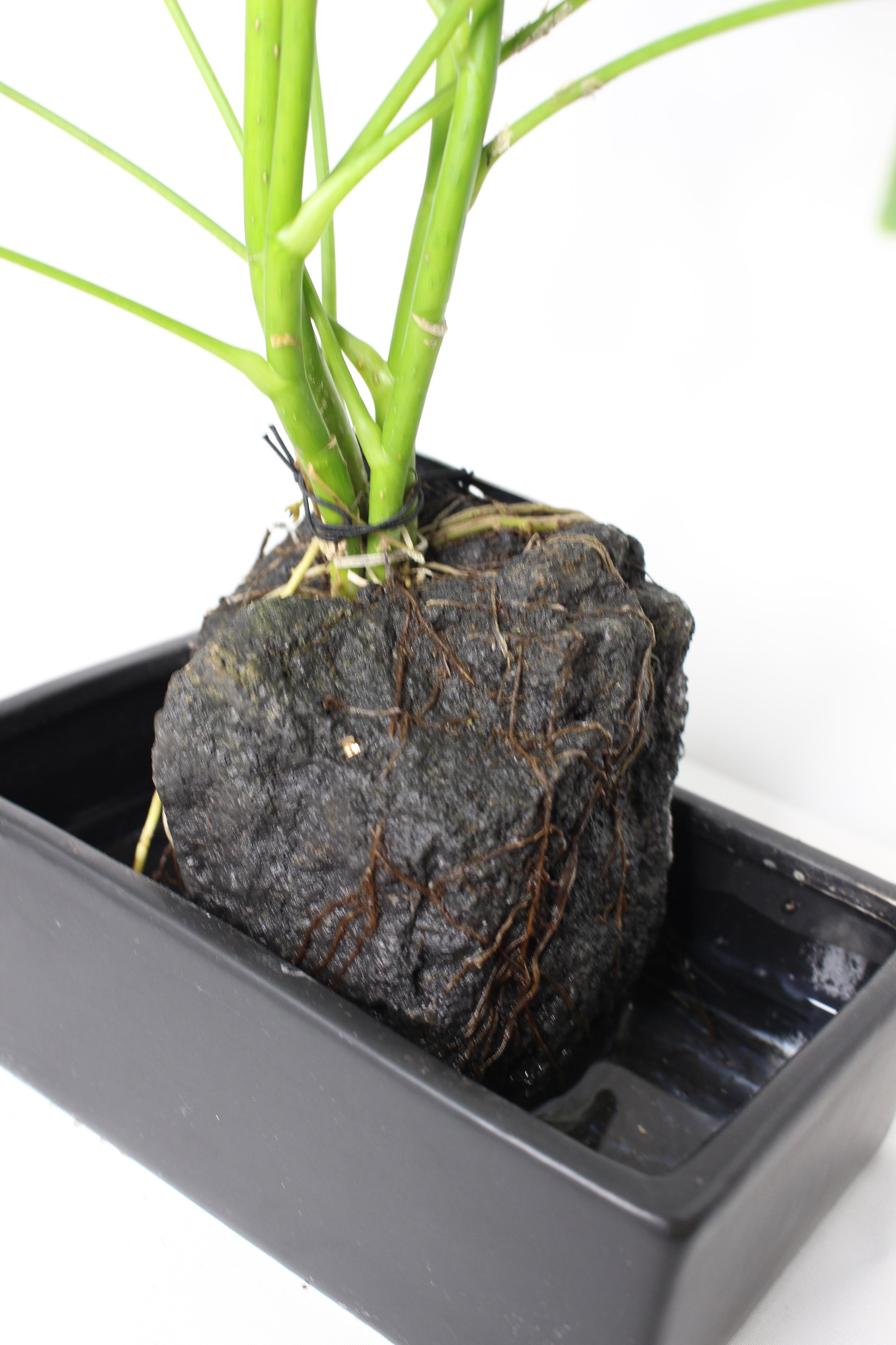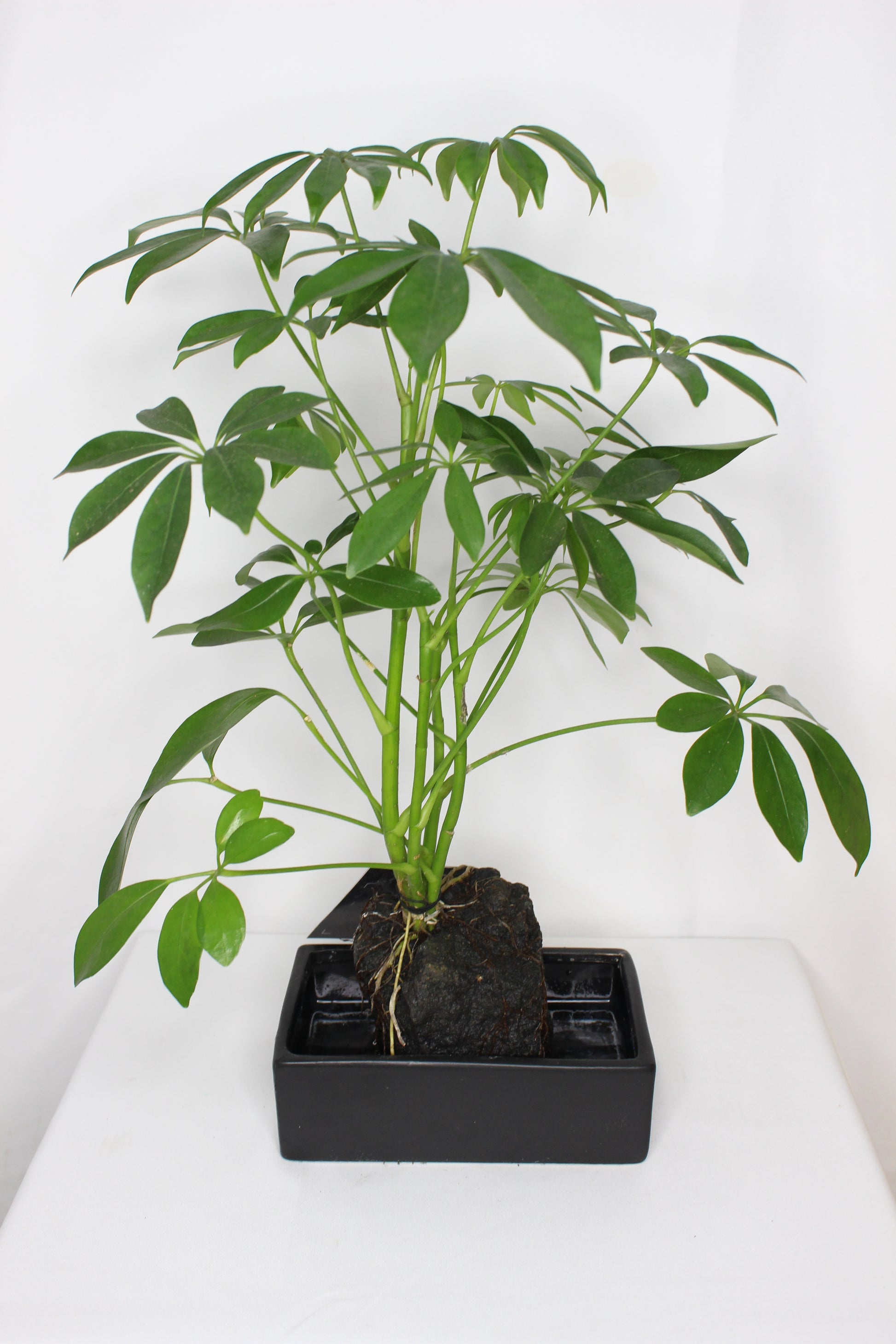 Schefflera Lova: planta de interior elegante con hojas verdes brillantes, cultivada sobre piedra volcánica , que alimenta sus raíces al absorber el agua; fácil de cuidar, ideal para ambientes luminosos con luz indirecta .
