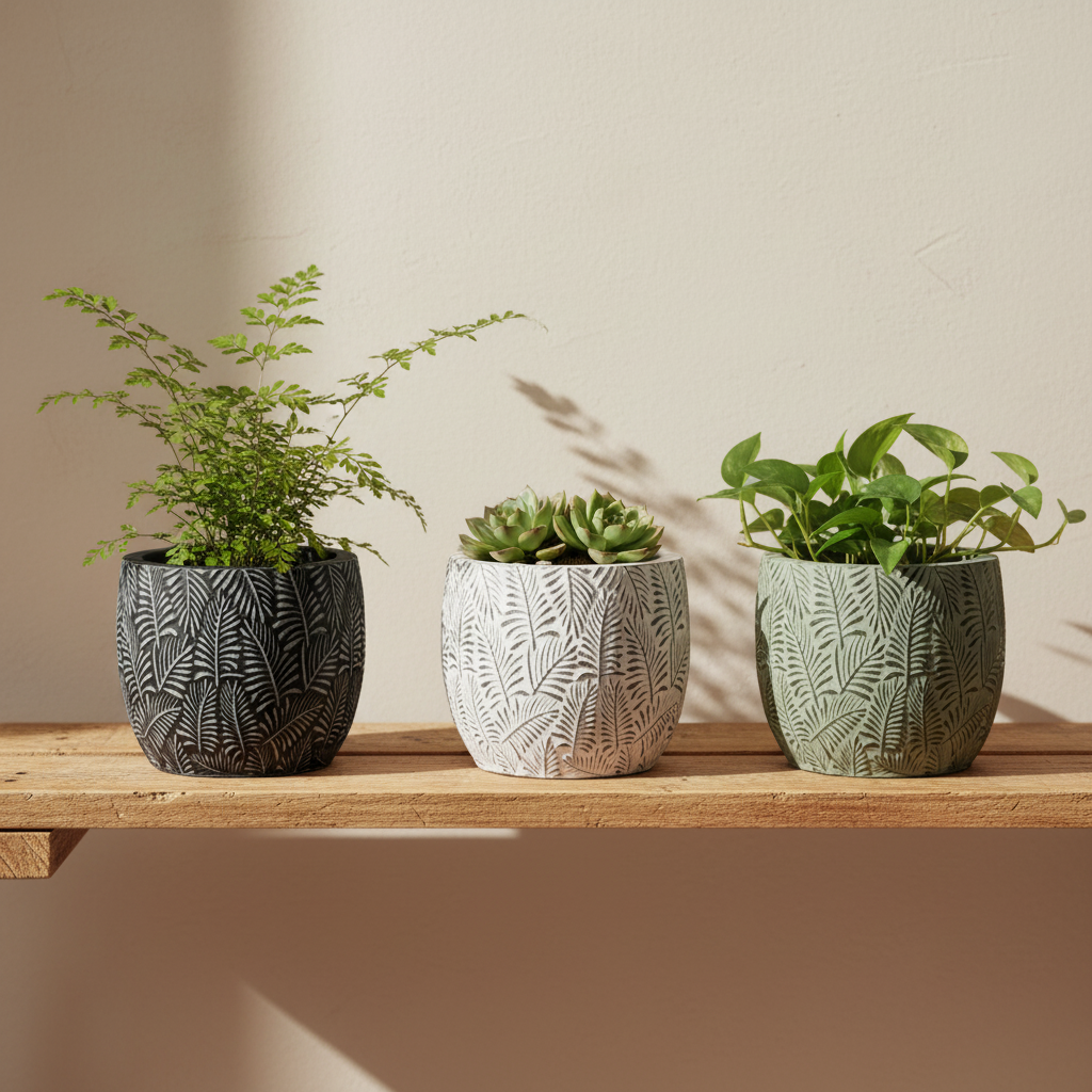 El Macetero Selva es una maceta decorativa diseñada para plantas pequeñas, suculentas, cactus, etc. Su diseño inspirado en la selva, con hojas tropicales, aporta un estilo fresco, natural y llamativo a cualquier espacio.